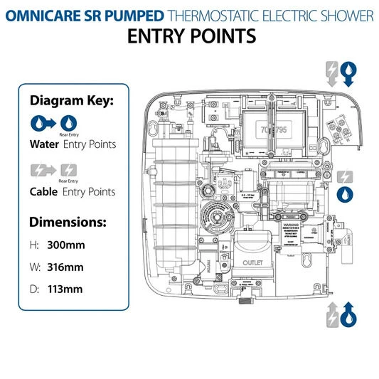 The Omnicare SR Pumped is ideal for low water pressure areas, featuring quiet pump technology for a tranquil showering experience. Designed specifically for use with a gravity fed cold water supply from a header tank, the integrated pump boosts the flow rate of your shower.